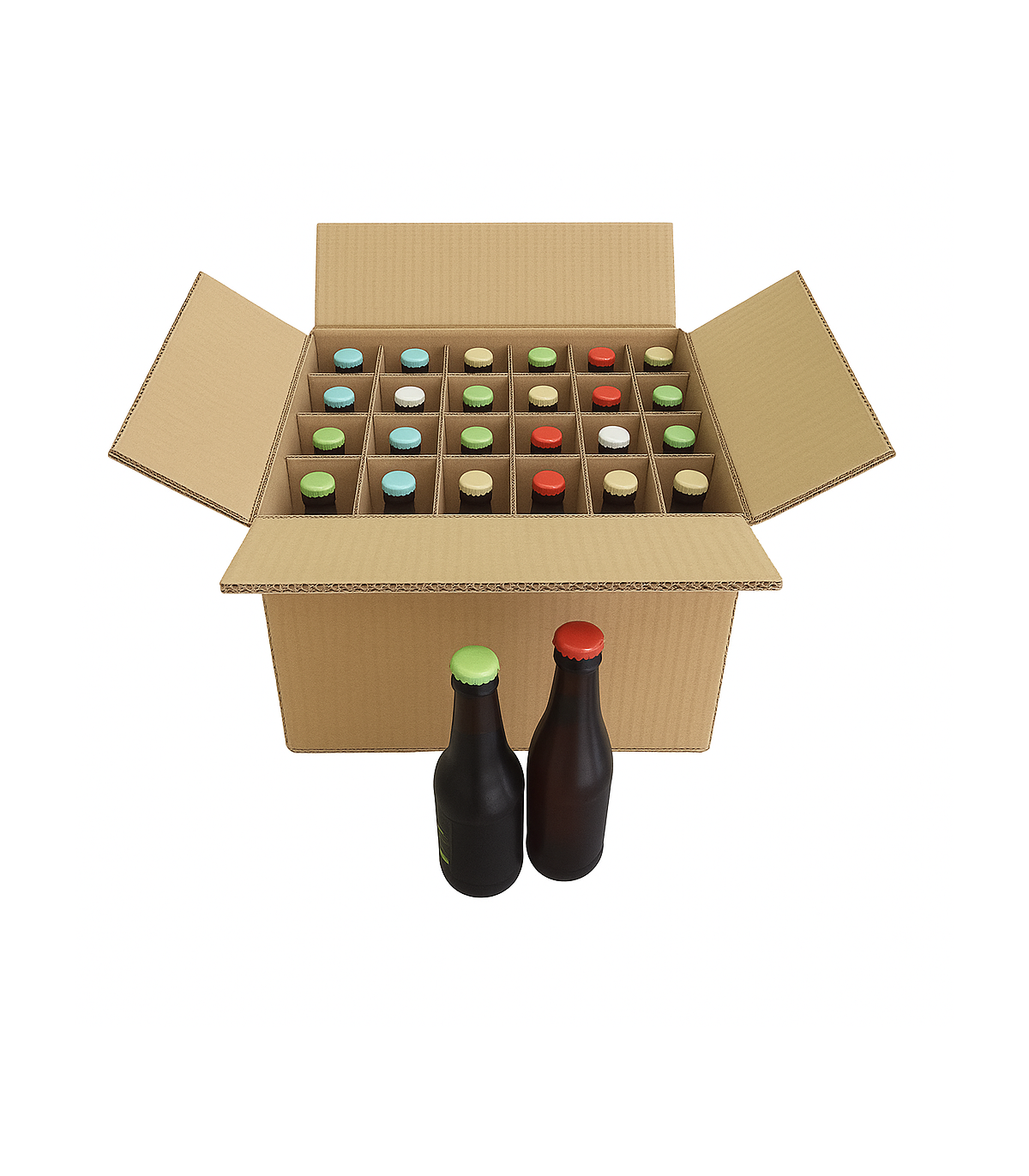 Caja de cartón ondulado para 24 botellas de cerveza de 33 cl. Fabricada en canal doble y color marrón, con separadores en canal simple para impedir que las botellas se puedan romper durante el transporte.