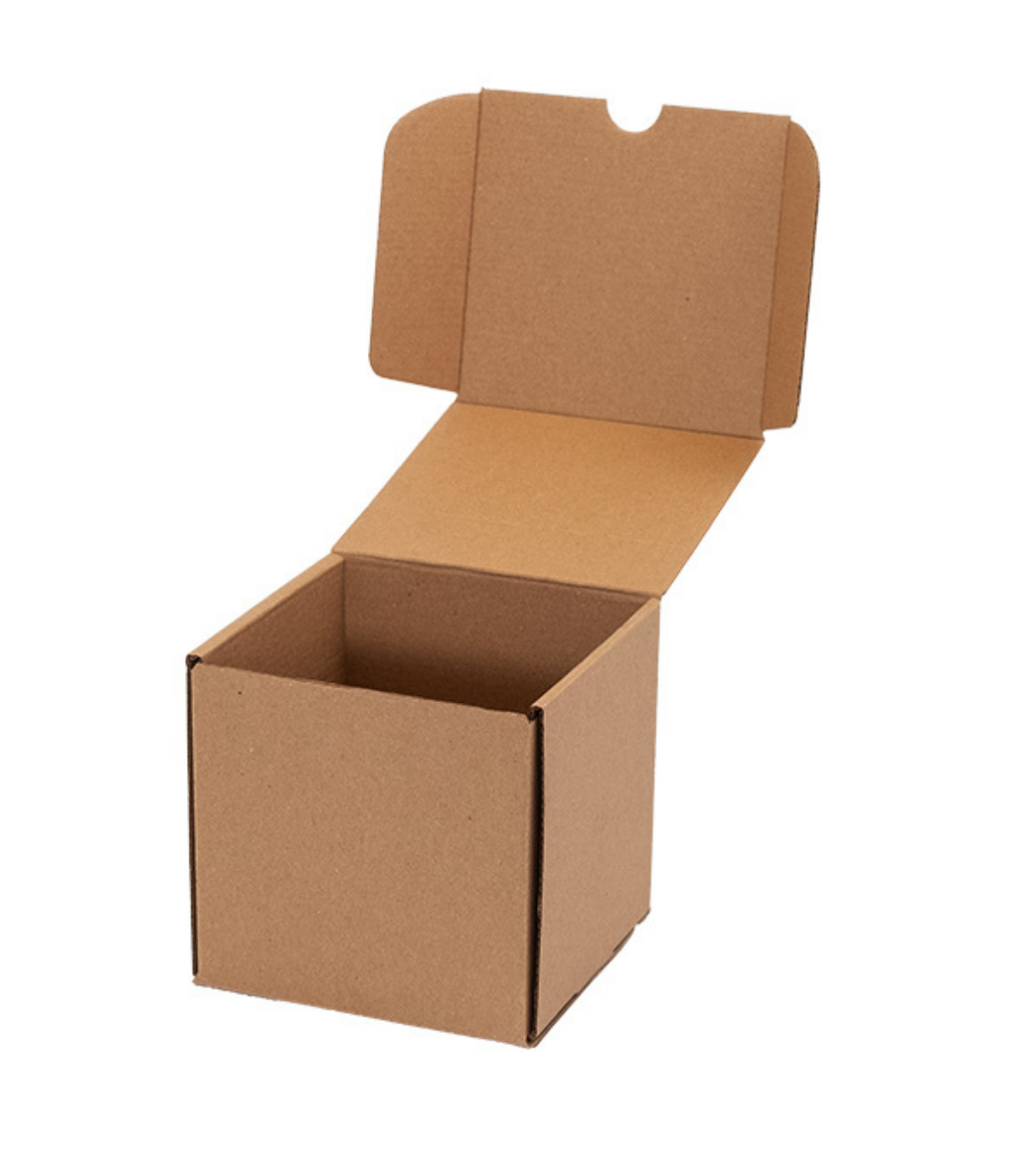 Caja troquelada para envíos de Ecommerce de medidas 13,8x13x13,3 cm, automontable en color kraft. Su formato compacto y prácticamente cúbico la convierte en una opción muy versátil para proteger productos de pequeño tamaño con volumen.