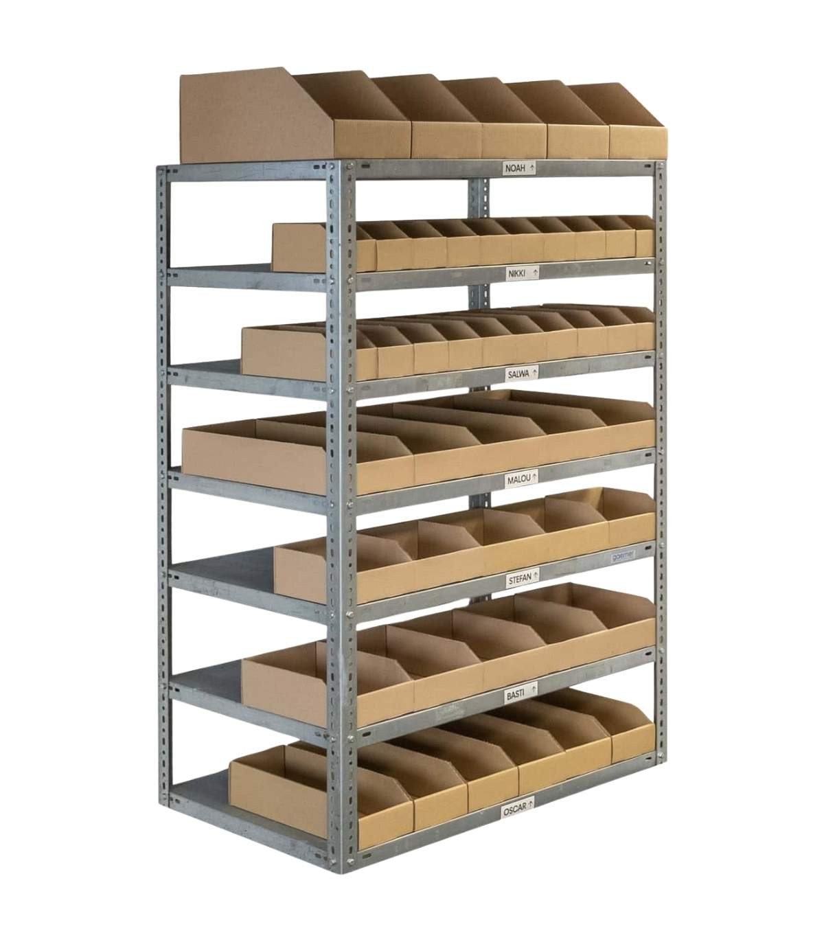 La caja de estantería "Noah", con unas dimensiones de 50 x 20 x 20 cm, un peso de 0,25 kg y un volumen de 19,5 litros, es perfecta para artículos de mayor tamaño como textiles, libros o material de oficina más voluminoso. Ofrece una opción ecológica y económica para tus necesidades de almacenamiento. Diseñada para adaptarse a las dimensiones estándar de estanterías, "Noah" maximiza el espacio de almacenamiento de forma eficiente. Su montaje es rápido y sencillo gracias a un sistema de encaje, y su certificación FSC refleja nuestro compromiso con la sostenibilidad. A pesar de su peso relativamente ligero, ofrece una solución de almacenamiento fiable con una capacidad de carga de hasta 25 kg, gracias a su resistente construcción en cartón ondulado de 3 mm.